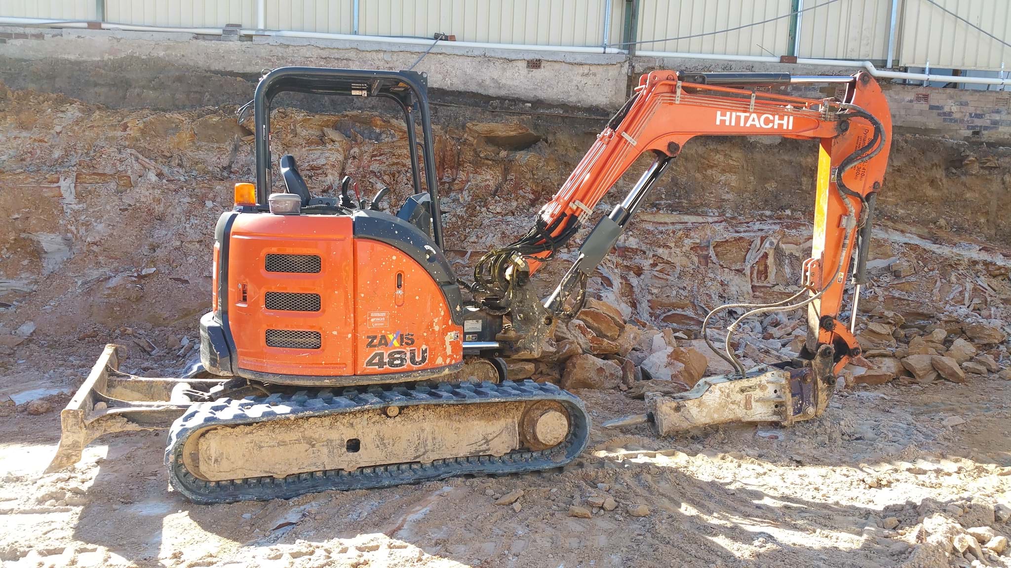 The 5 tonne Hitachi Excavator is the strongest of the small excavators. It can fit into most residential properties, but still has power and reach to excavate bigger sites. Attachments include a rock breaker, rock saw, sieve bucket, ripper, grabs, and various augers and trenching buckets.